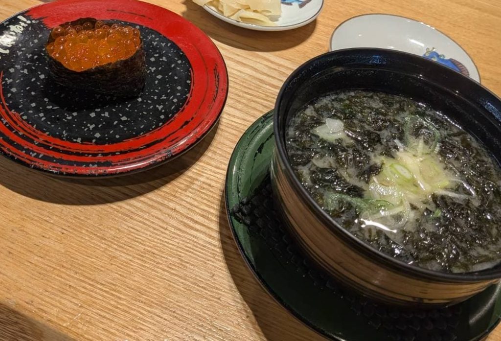 回転寿司もとっても美味しい!!毎回、いくら軍艦と海苔のお味噌汁はマストで注文w